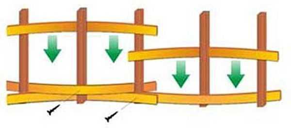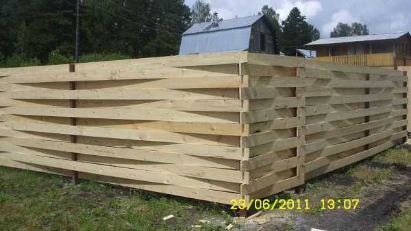 По сути, это один из подвидов штакетника. Доски набиваются попеременно то с одной, то с другой стороны поперечной перекладины. Получается интересный объемный вид.