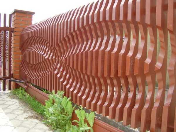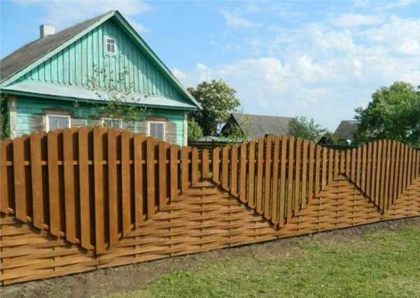 Необычно выглядит ограждение, выполненное из гнутых между столбами досок. Они переплетены между столбами по типу традиционного плетня. Только делают его из длинных досок.