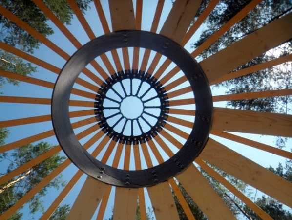 В отличие от конической крыши, которую строят с использованием наслонной стропильной системы, купольная крыша имеет висячую стропильную систему. Обычная трехшарнирная арка, которой, по сути, являются висячие стропила, опирается одним концом на мауэрлат, проложенный по стене, а вторым – на опорное кольцо, которое монтируется вверху столба, установленного в центре сооружения.