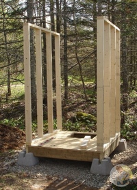Без рамок — для облегчения строительства. Подкосы не нужны. Три щита сбить вместе с распашной дверью с окном. Сверху — плоская крыша. Облицовка — в любое время.