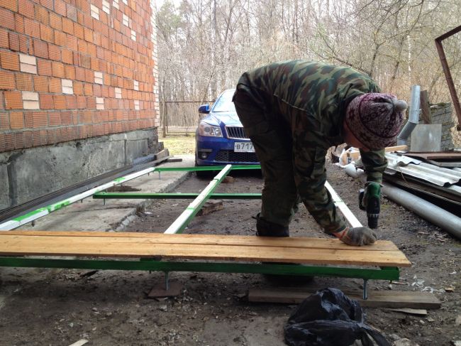 С помощью шуруповерта и саморезов собирается пол из досок. Необходимо тщательно подогнать доску к доске. Дерево можно обработать средством против жучка и гниения.