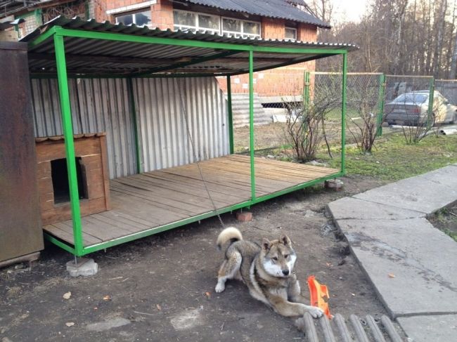Чтобы было комфортно пользоваться такой конструкцией, в ней предусмотрено окошко для подачи еды, а наклонная крыша не позволит снегу скапливаться наверху. Дверь открывается внутрь и не контактирует с потолком и поверхностью пола. Такой вариант встречается на участках чаще всего. Он считается самым доступным и легким. При выборе подобного вольера нужно следить за качеством материала и учитывать размеры своей собаки – ей не должно быть там тесно.