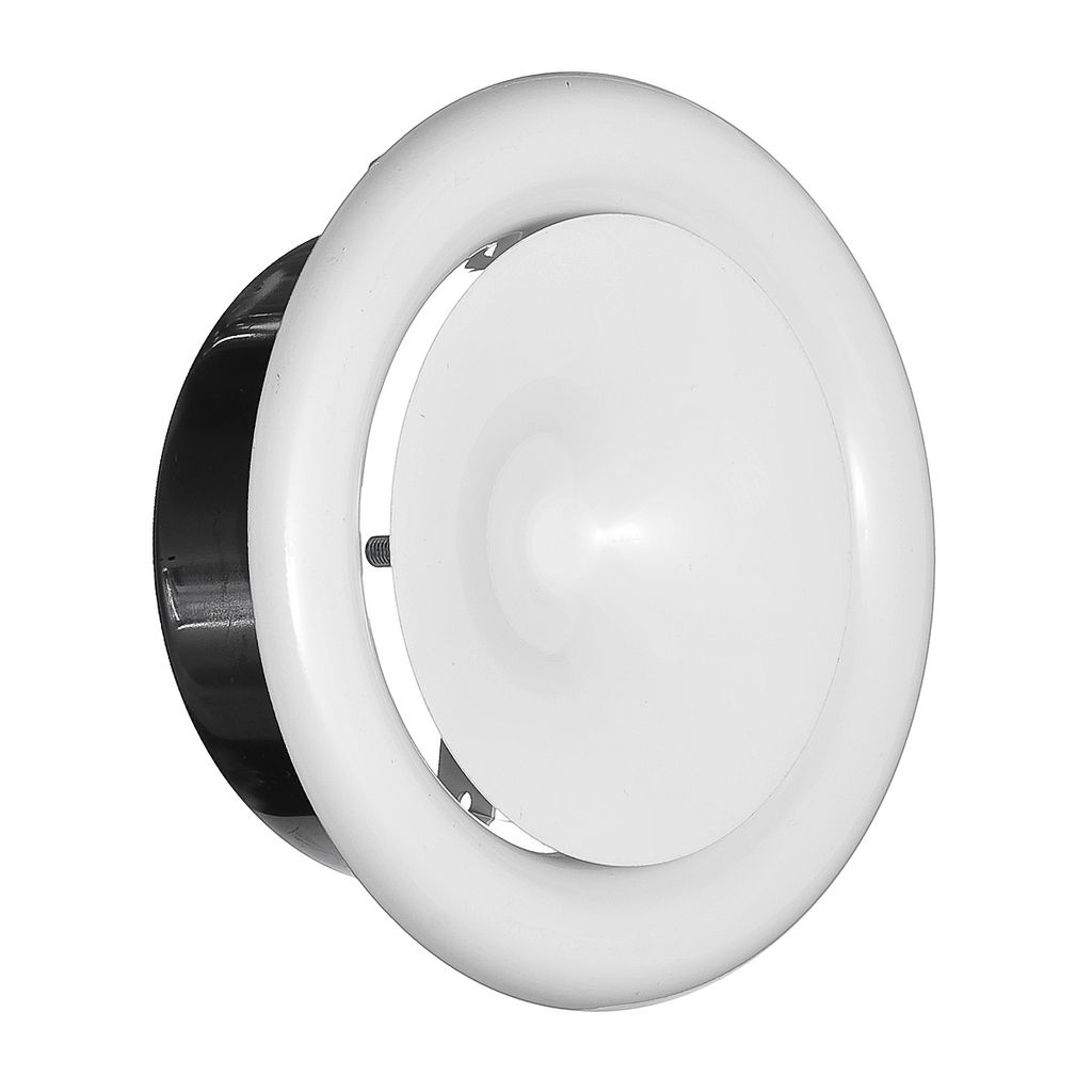 Этот потолочный прибор эффективен при вентиляции воздуха в помещениях с высотой потолка от 2,5 до 4 метров. Допустим монтаж сразу нескольких диффузоров, их можно установить в один ряд. Потолочный крепеж производится за счет штифтов, которые идут в комплекте с основным прибором. Процесс герметизации производится при помощи торцевых уплотнителей заранее установленных на конструкции.