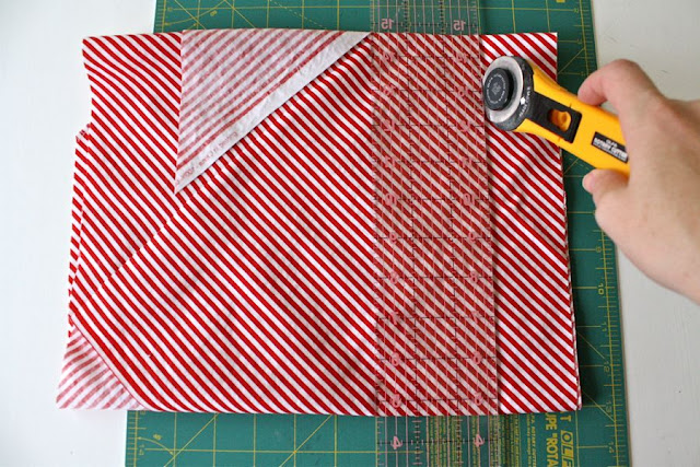 Согните ткань так же, как мы это делали в первоначальных направлениях, чтобы вы могли разрезать больше слоев сразу, от края смещения. Если есть лишняя ткань, которая недостаточно широка, чтобы быть полоской, просто обрежьте ее, прежде чем начинать резать полосы (как на фото ниже):