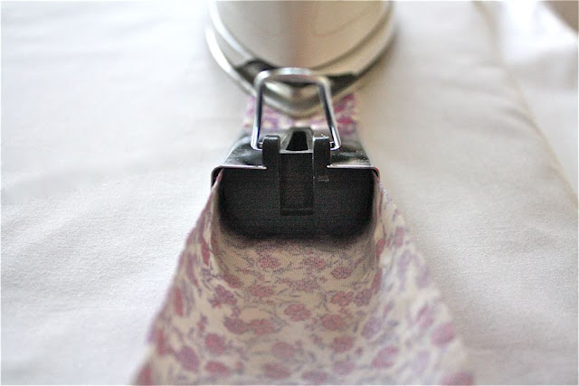 После того, как все ваши полосы сшиты, наступает время для складывания. Вставьте конец длинной полоски ткани в устройство смещения ленты. Угловой край поможет ему легче войти. Если вам трудно вытащить его из другого конца, используйте рыхлитель шва или другой небольшой предмет, чтобы прилипнуть внутрь устройства и потянуть его вперед.