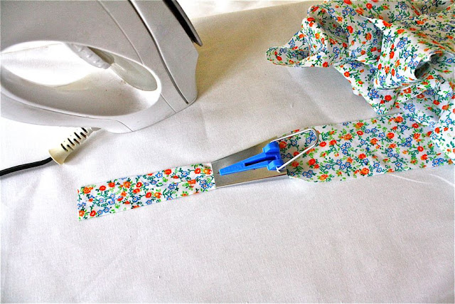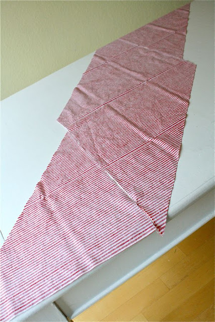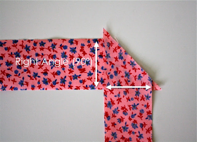 Сшивайте 3 части вместе в этих двух точках, гладьте швы, и теперь у вас есть один длинный кусок ткани, чтобы отрезать полоски смещения.