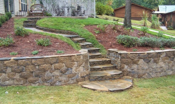 Постройки террас всегда подразумевают наличие тропинок и дорожек. В некоторых местах делаются ступеньки. Для подпорных стенок террас заказываются различные материалы: