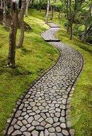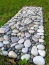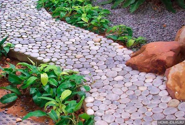 На оригинальных дорожках из булыжника и валунов, камень немного прикапывают, оставляя на поверхности примерно половину объема.