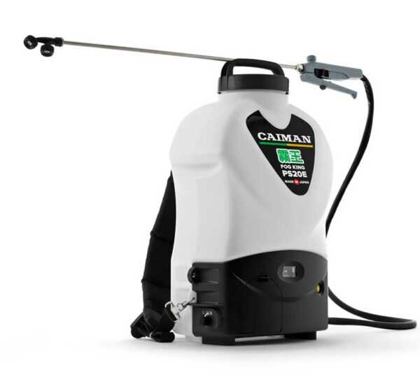 - Caiman Fog King PS20E — аккумуляторный опрыскиватель весом 5 кг. Внутри установлен литий-ионный аккумулятор на 4 А/ч. Объем емкости составляет 20 литров. Жидкость выдается с производительностью 1,5 литра в минуту. Для переноски предусмотрен ранцевый ремень. Модель подходит для дезинфекции и опрыскивания разных растений. Создаваемого давления в 10 бар достаточно для эффективного применения.