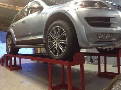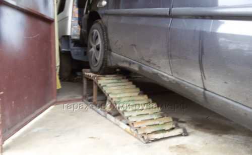 Довольно простой в изготовлении является «качалка», она является достаточно простой и ее может изготовить практически любой автовладелец. Все мы знаем принцип работы обычной детской качели, ее механизм заключается в том, что из-за перевеса одна сторона всегда находится выше другой. Для изготовления качели для вашего транспортного средства нужно выполнить похожую работу, вам необходимо сделать платформу, одна из сторон которой будет приподниматься при заезде на нее автомобилем. Для того чтобы автомобиль не перевернулся, на задней части платформы устанавливаются опорные столбы, а на переднюю часть нужно сделать специальные переносные опоры, благодаря которым машина не скатится вниз. Размеры платформы должны подбираться под колесную базу и клиренс автомобиля.