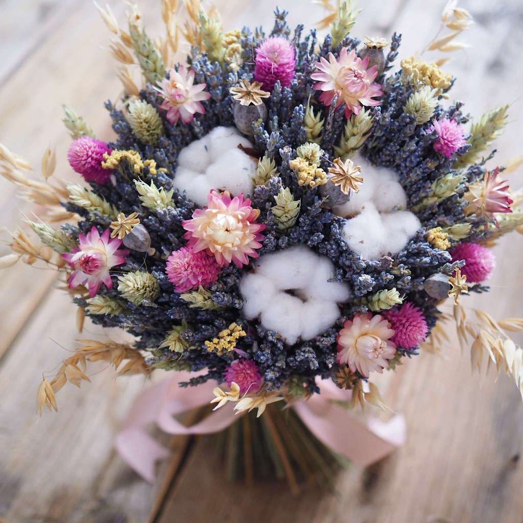 Натуральные букеты. Неяркие, пастельные идеально впишутся в любой интерьер. Тем более, минимализм сейчас в моде. Хорошим вариантом может стать монобукет, то есть однокомпонентный. Например, просто лаванда, или просто хлопок, или просто пшеница…