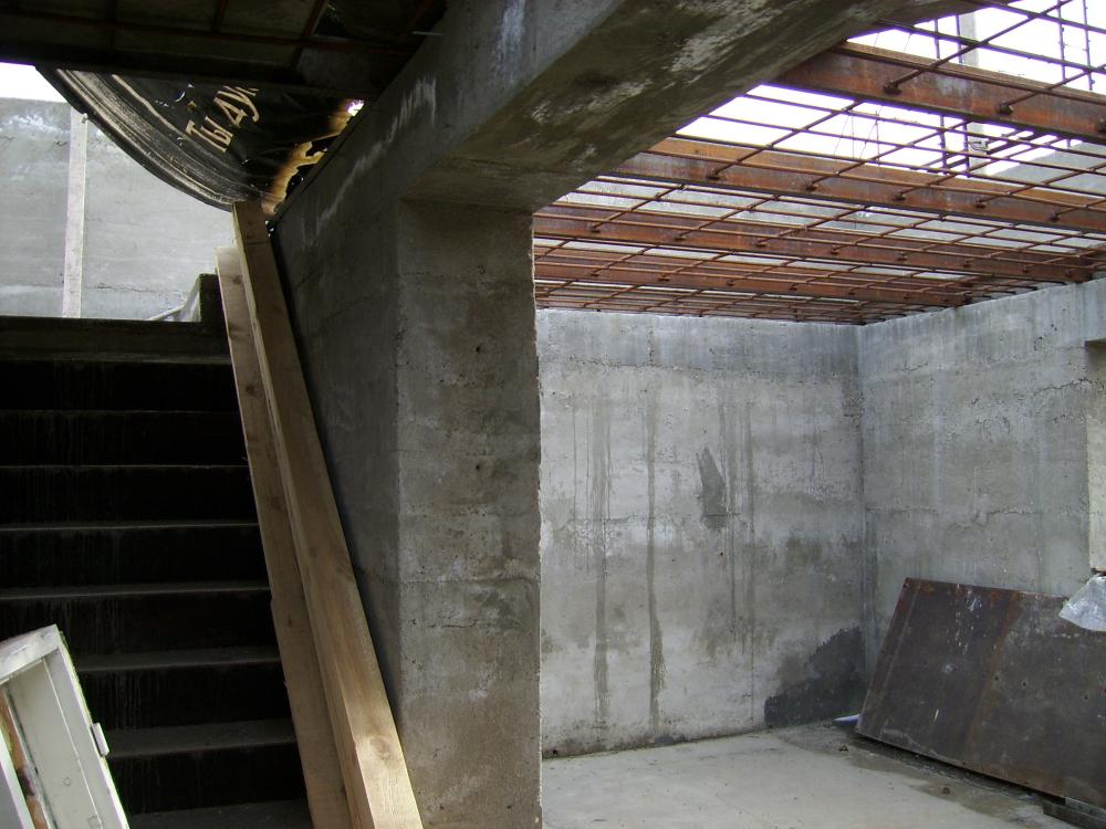 Для этого по периметру здания ближе к наружной стене уложили арболитовые блоки 150x200x500 мм (то есть, как сказали бы каменщики, в полкирпича, в данном случае — в полблока). Они служат с внешней стороны стены опалубкой для дальнейшей заливки бетона, и как дополнительное утепление армопояса. С внутренней стороны соорудили опалубку из обрезной доски. В получившееся углубление по всему периметру здания уложили арматуру 010 мм в 6 нитей, а затем залили бетон такой же марки, что использовали для фундамента. Армопояс связал здание в прочную и надёжную конструкцию. Когда силовой каркас был готов, уложили перекрытия между первым и вторым этажом — бескаркасные бетонные плиты шириной 150 мм, которые были заказаны специально для данного проекта. На эркере выступающие части плит обрезали и придали им необходимую конфигурацию. По периметру плиту также утеплили арболитовыми блоками 150x200x500 мм, как и армопояс.