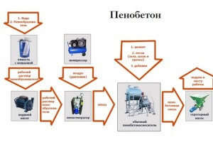 Для производства пенобетонного блока используют бетонную смесь, в которую добавляют определенные компоненты, способствующие пенообразованию. Они могут быть органическими или синтетическими. Полученная смесь распределяется по заранее заготовленным формам, где в конечном счете затвердеет.