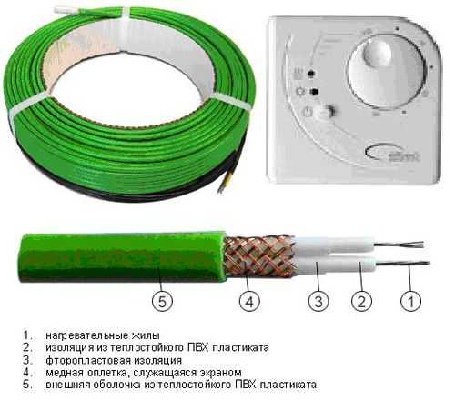 Жила отвечает за нагрев. Её изготавливают из специальных сплавов, обладающих высоким электрическим сопротивлением. Жилу защищает специальная оболочка. Она делается из изолирующего материала и экранируется алюминиевым слоем или медной сеткой. Ну и наконец, последний слой, который имеет кабель – общая оболочка. Материал, из которого она производится, называется поливинилхлорид. Он отлично защищает всю конструкцию от внешних воздействий.