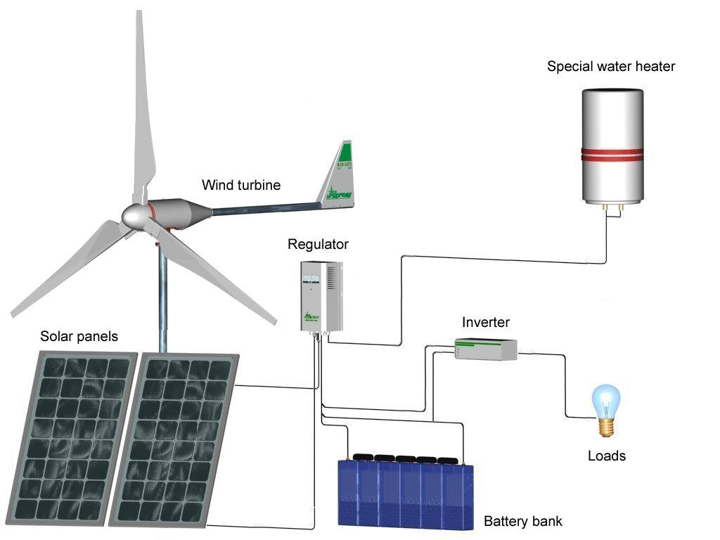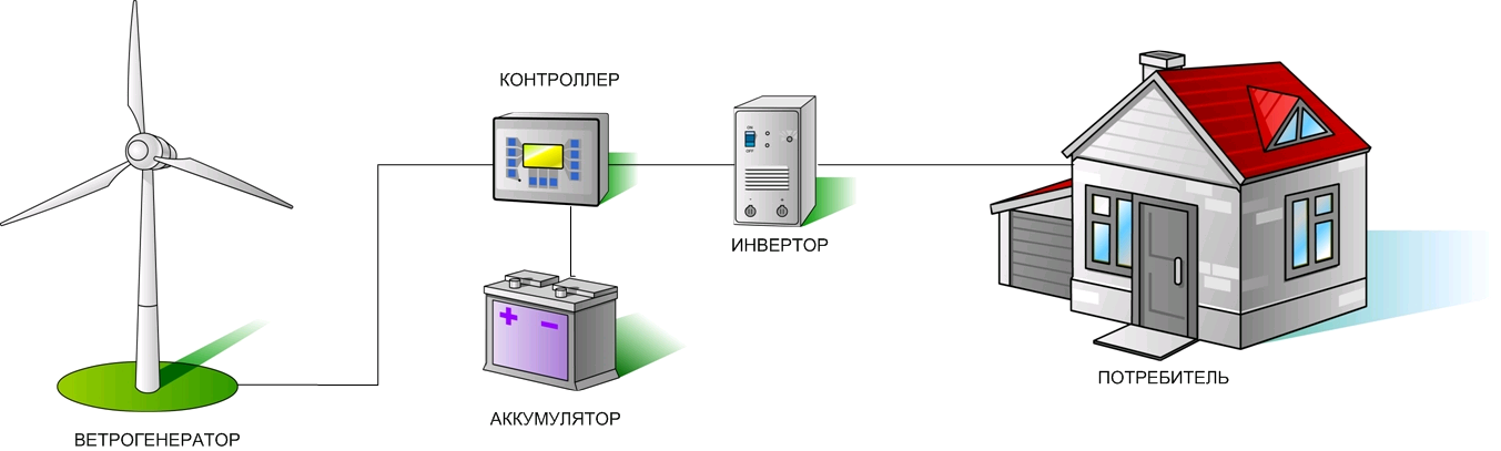 Вышеописанный принцип работы лежит в основе практически на всех моделей ветровых генераторов. Наличие в системе АКБ обеспечивает электроснабжение при штиле или недостаточной для воздействия на лопасти силе ветра. Разработчики конструкций стремятся предусмотреть различные эксплуатационные ситуации, чтобы системы работали в максимальном диапазоне непредсказуемых погодных условий.