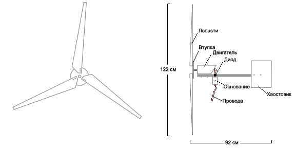 Конструкция устройств, использующих безвозмездный источник энергии, достаточно проста. Ветряная электростанция состоит из лопастей, мачты, электрогенератора и дополнительных приборов, обеспечивающих преобразование, накопление и передачу к потребителям электроэнергии.