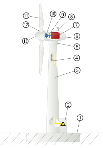 В ветряных турбинах есть несколько частей, которые преобразуют энергию ветра в электрическую. Ветряные турбины состоят из лопасти ротора, гондолы, башни и электрического оборудования.Наиболее распространенная модель ветряных турбин с горизонтальной осью имеет три лопасти ротора, изготовленные из полиэстера, армированного стекловолокном, или древесно-эпоксидной смолы. Лопасти ротора преобразуют энергию ветра в энергию вращения внутри турбины. В гондоле находятся трансмиссия, редуктор и генератор. Турбина находится внутри коробки передач. Круговое движение турбины приводит в действие генератор, который затем преобразует кинетическую энергию ветра в электрическую.Ветряки размещаются на башнях высотой от 40 до 90 метров.Поскольку на больших высотах турбулентность воздуха меньше, ветряные турбины наиболее эффективны при установке на высоких башнях. Башни построены из стали. Электрооборудование, в основном провод, проходит через стальные опоры, так что энергия может быть распределена либо индивидуальному клиенту, либо передана в электрическую сеть.