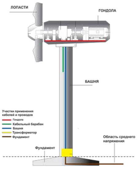 - Башня — используется для поднятия гондолы, ступицы и лопастей, чтобы усилить ветер.