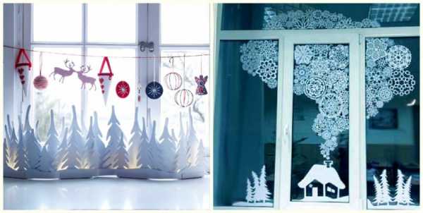 Распечатайте рождественские картинки и поместите на стекло. Или распишите гуашью.