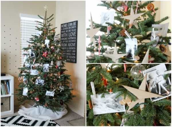 Разместите на стене в форме пирамиды электрогирлянду, пластиковые игрушки, фотокарточки или другие предметы, используя двусторонний скотч или канцелярские кнопки. Такая ель станет беспроигрышным вариантом в заставленных мебелью комнатах.