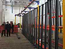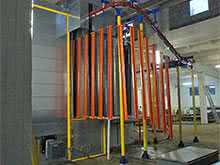 Покрасочные цеха оборудованы двумя независимыми покрасочными линиями. На одной окрашиваются плоскостные элементы (полки), на другой – длинномерные (стойки, балки).