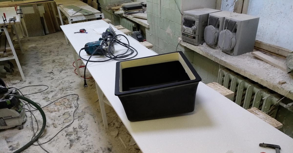 Некоторые из инструментов для выполнения работ по изготовлению столешницы.- Емкость для замешивания раствора и миксер.