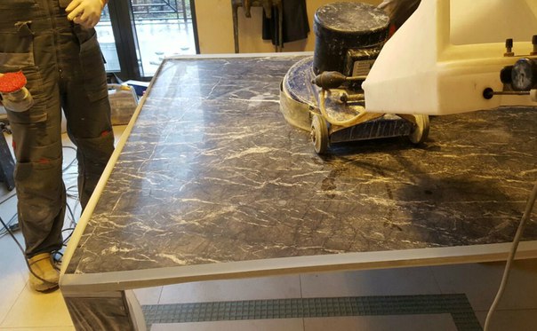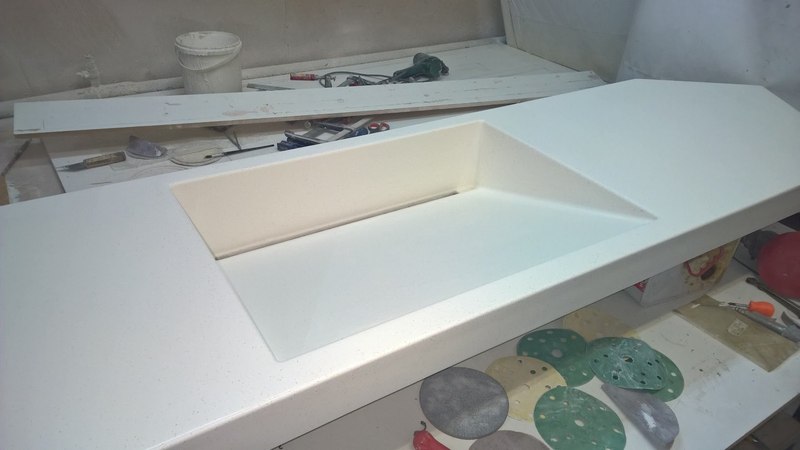 - Искусственный камень на полиэфирной основе, несмотря на все, выше перечисленные достоинства, бывает неустойчив к моющим средствам, в состав которых входят абразивные включения. Использование их может привести к образованию на полированной поверхности микроскопических царапин, что со временем лишит столешницу красивого блеска. Полировка подобных изделий — весьма сложная и дорогостоящая процедура, так как для проведения этого процесса потребуется специальное оборудование. Но полностью возвратить первоначальный вид изделию — вполне возможно. Еще одна сложность, с которой придется столкнуться — это трудоемкость в обработке и в монтаже деталей из такого искусственного камня.