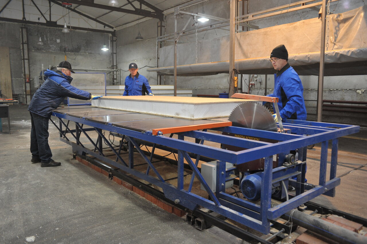 Из готовых сип-панелей далее формируется домокомплект. Такое производство панелей для сборки конкретных строений – очень удобно. Немного напоминает конструктор: на станке для раскроя панелей вырезаются детали «конструктора» нужных размеров, дверные и оконные проемы; у отдельных панелей выбираются пазы на станке для выборки утеплителя.