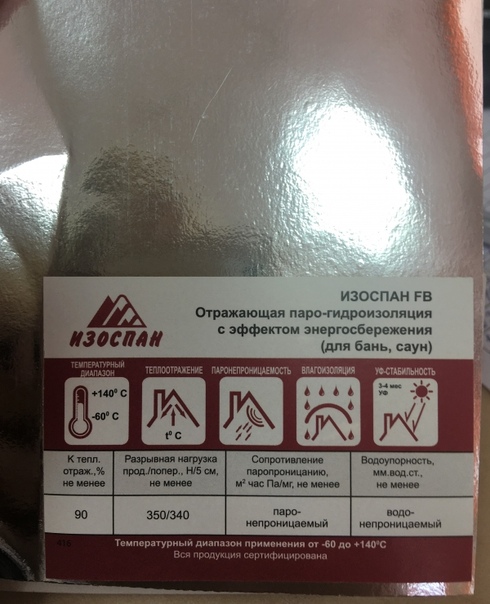 Материал изоспан fb используется как отражающий слой пароизоляции и обладает энергосберегающим эффектом. Поэтому он применяется в помещениях с высокой влажностью и температурой до +140°С. Это бани, сауны, закрытые бассейны, и т. д. Изоспан FВ изготавливается с использованием бумаги крафт с добавлением металлизированного лавсана. Строительная пленка пароизоляционная изоспан может эффективно отражать тепловую энергию.