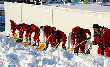 Уборку снега альпинисты производят обычными лопатами или скребками, освобождая крышу участок за участком. Это небезопасная работа, которая требует серьезных физических усилий и тренированного тела.