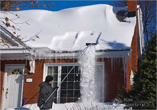 Лучший способ очистки крыши с точки зрения безопасности — уборка снега с земли. Но использовать его можно только в том случае, если высота дома не более 1 этажа. Применяются заводские скребки или самодельные устройства, которые несложно смастерить своими руками из подручных материалов.