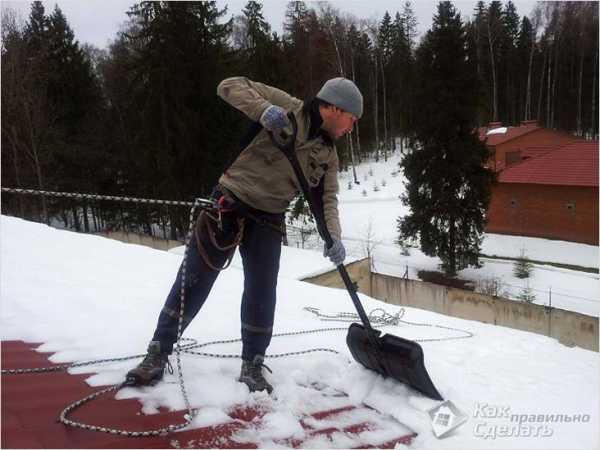 Важно. В любом случае не рекомендуется заниматься очисткой кровли в одиночку без помощников. Работать нужно со страховкой. Для этого обвязываются прочной веревкой или закрепляют ее на монтажном поясе.