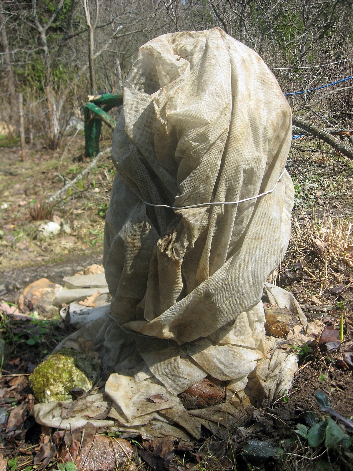 Есть и другие варианты каркасного утепления. В более мягком климате можно ограничиться цилиндром из сетки, заполненным сухой листвой. Этот же каркас легко обернуть плотным лутрасилом и пленкой при более серьезных морозах.