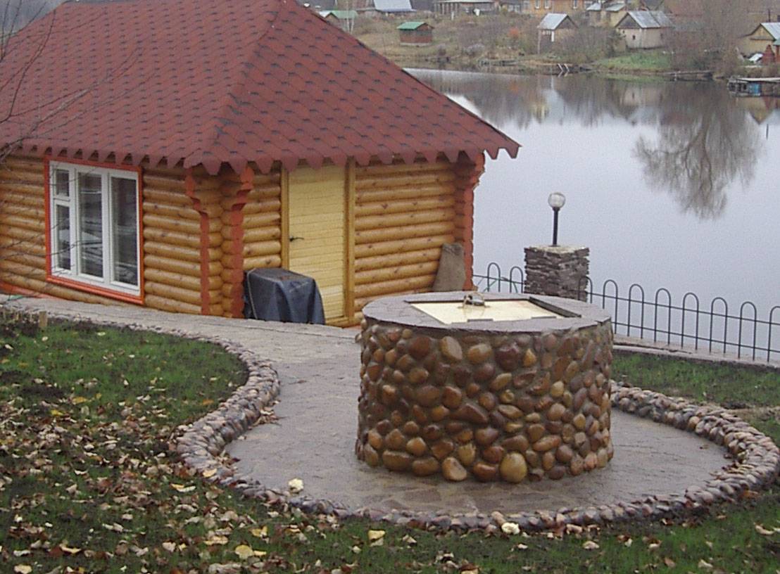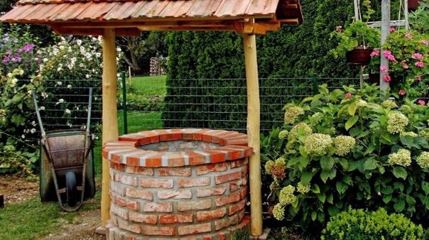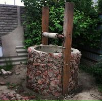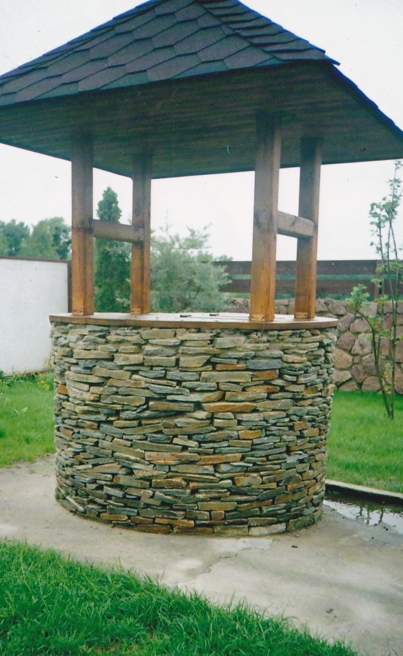 Колодец, основание которого оформлено природным камнем, выглядит сказочно. Кажется, будто он появился из волшебного королевства, где обитают фантастические существа, эльфы и гномы. Сочетая камни разных оттенков, можно выложить живописные узоры, орнаменты и от вашего колодца будет глаз не оторвать. Дорожки, выложенные брусчаткой, морской галькой, газоны с сочной травой сделают всю композицию чрезвычайно привлекательной.