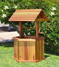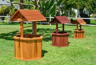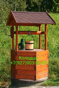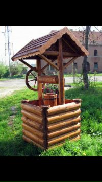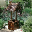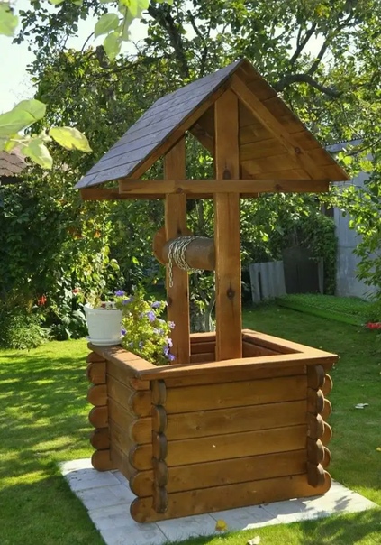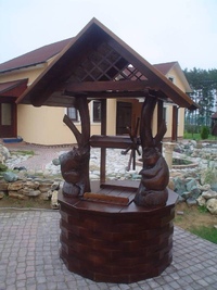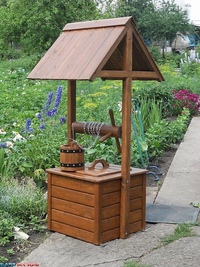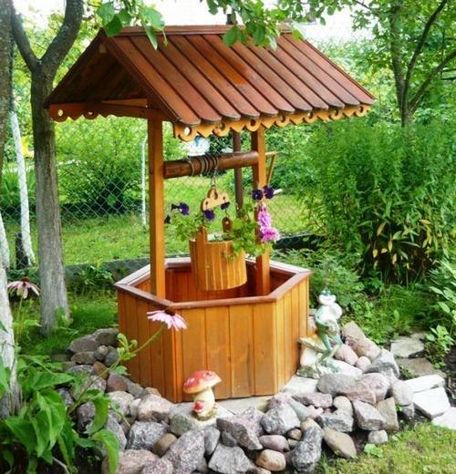 Если домик выполнен из дерева, для украшения можно использовать резные детали. При помощи пропиток и лаков разных оттенков дерево можно сделать солнечно-желтым или затемнить. Часто возле колодцев устанавливают различные деревянные скульптуры.