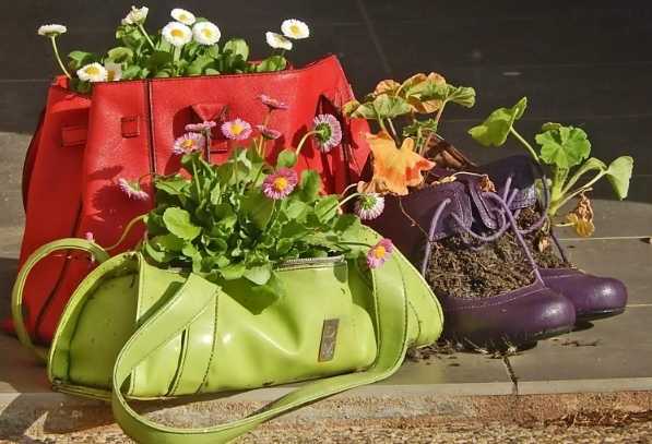 В обустройстве ландшафтного дизайна могут участвовать старые ботинки и сумки. Данные предметы наполняются землей и развешиваются по всему участку. В таких интересных клумбах отлично растет лобелия и петунья.