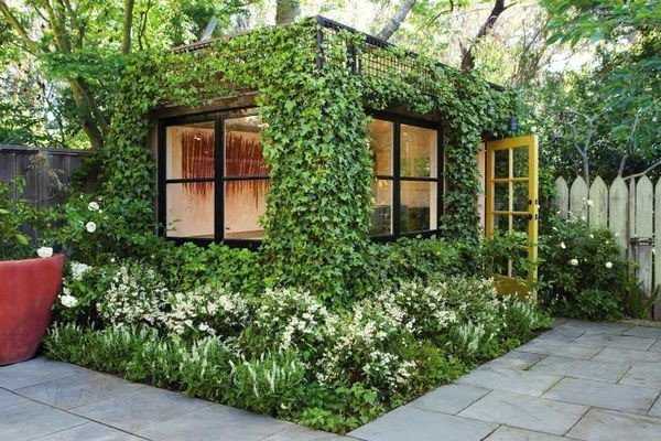 Некрасивости соседских построек можно закрыть вьющимися растениями – девичьим виноградом, клематисами, плетистыми розами. Но все эти растения растут не так быстро. Рядом сними можно высадить однолетние лианы – ипомею, кобею, тунбергию, вьющийся горошек. Для них достаточно установить шпалеру или трельяж. Когда многолетние лианы подрастут, они займут свое место этих опорах.