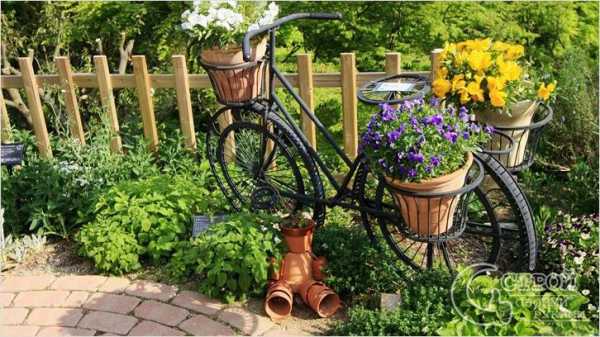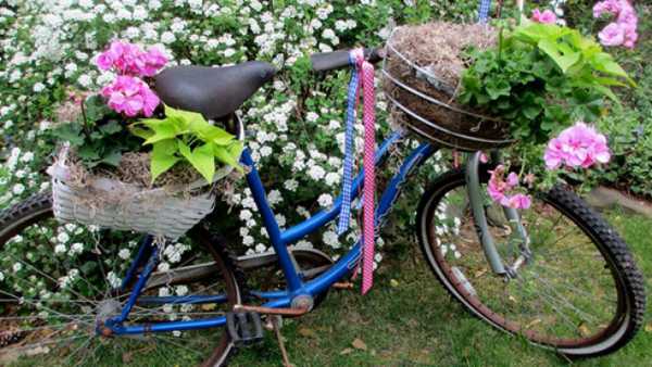 Сломанный велосипед можно также превратить в оригинальный вазон. Вместо сидения и руля устанавливаем горшечные цветы. Только не забудьте зафиксировать конструкцию.
