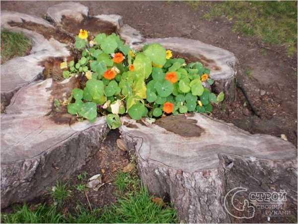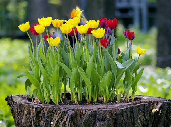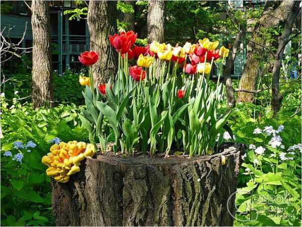 Тюльпаны на пнеОбратите внимание! Пень, который обычно остается от рубки деревьев, может стать природным горшком для посадки разнообразных растений. Выкорчевываем, очищаем сердцевину (делаем чашу), засыпаем землей и высаживаем цветы.
