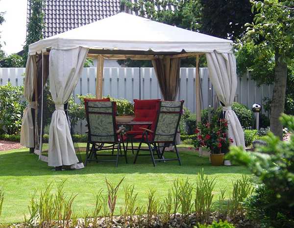 Самые романтичные беседки во дворе — это шатры, в которых развеваются ткани и много красивой дачной мебели. Благоустройство двора частного дома таким шатром — одно из самых приятных занятий!