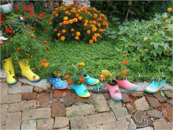 Не забывайте о том, что даже ненужная старая обувь может стать оригинальным украшением участка. Возьмите пару ярких детских резиновых сапог, сделайте отверстия в подошве, насыпьте туда дренаж, затем грунт и посадите цветы. Получатся отличные садовые кашпо для уличных цветов. И особенно приятно, что мы украшаем двор своими руками без лишних затрат.