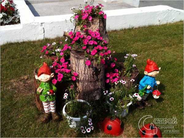 В старых пнях можно так же устроить красивые садовые клумбы своими руками. Они очень просты, и изящны. Такое украшение двора своими руками может быть сезонным, если посадить в пни тюльпаны