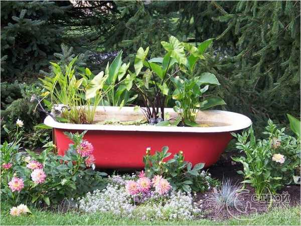Ванна в садуУже имеющийся водоем можно превосходно преобразить с помощью клумб, плавающих по поверхности. Смастерить такую клумбу очень просто: берем емкость из пластмассы, проделываем в дне небольшие дырочки, выстилаем геотекстиль и засыпаем почвой. Поверх можно высадить любимые цветы и опустить конструкцию на воду.