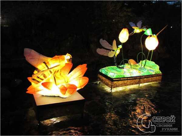 Самодельное освещениеЧтобы ваша дача радовала глаза не только в дневное время, но и ночью, стоит задуматься об освещении, но не просто установить фонари или провести свет по периметру, можно сделать так, чтобы участок в ночное время завораживал и привлекал к себе внимание. И помогут в этом простые жестяные банки. Берем банку, рисуем любой интересный рисунок, делаем по рисунку дырочки с помощью гвоздя или шила. Осталось покрасить корпус в яркий цвет и прикрепить ручку из проволоки. Устанавливаем внутрь свечу. Можно скрепить несколько банок и повесить гирлянду из них на определенном участке сада. Для декора подойдут и стеклянные банки. Расписываем их акриловыми красками и устанавливаем свечи.