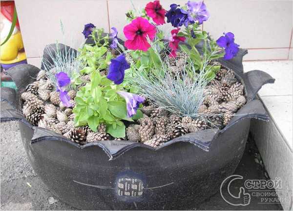 Если предварительно покрасить старые покрышки автомобиля, то в них можно рассадить цветы.
