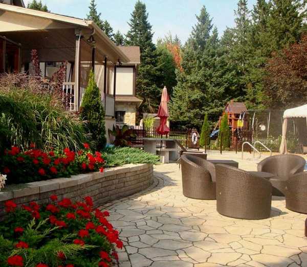 Каменные элементы могут стать декором дорожки. Из камней или кирпича можно составлять невероятно уютные площадки для отдыха — патио, которые способны украсить любой двор частного дома.