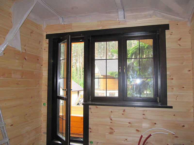 - Натуральная деревянная вагонка подойдет тогда, когда стены выстроены из бруса или бревна, или же облицованы древесиной (натуральным блок-хаусом). Вагонка будет отлично гармонировать с этими материалами, особенно если ее используют в комплексе с наличниками.