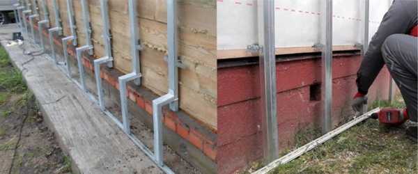 ΠΠ΅ΡΠ²ΠΎΠΉ Π½Π° ΡΡΠ΅Π½Π°Ρ Π·Π°ΠΊΡΠ΅ΠΏΠ»ΡΠ΅ΡΡΡ ΡΡΠ°ΡΡΠΎΠ²Π°Ρ ΠΏΠ»Π°Π½ΠΊΠ°. ΠΠ»Ρ ΡΡΠΎΠ³ΠΎ Π²ΠΎΠΊΡΡΠ³ Π΄ΠΎΠΌΠ° Π½Π° Π³Π²ΠΎΠ·Π΄ΠΈΠΊΠ°Ρ ΠΏΠΎ ΡΡΠΎΠ²Π½Ρ Π½Π°ΡΡΠ³ΠΈΠ²Π°Π΅ΡΡΡ Π²Π΅ΡΠ΅Π²ΠΊΠ° Π½Π° Π²ΡΡΠΎΡΠ΅ 3-4 ΡΠΌ ΠΎΡ Π½ΠΈΠΆΠ½Π΅Π³ΠΎ ΠΊΡΠ°Ρ ΠΌΠΎΠ½ΡΠΈΡΡΠ΅ΠΌΠΎΠΉ ΠΎΠ±ΡΠΈΠ²ΠΊΠΈ. Π‘ΡΠ°ΡΡΠΎΠ²ΡΠ΅ ΠΏΡΠΎΡΠΈΠ»Ρ ΠΊΡΠ΅ΠΏΡΡΡΡ ΠΏΠΎ ΠΏΠ΅ΡΠΈΠΌΠ΅ΡΡΡ Π·Π΄Π°Π½ΠΈΡ Π½Π΅ Π²ΡΡΡΠΊ, Π° Ρ ΠΏΡΠΎΠΌΠ΅ΠΆΡΡΠΊΠ°ΠΌΠΈ Π² 5β6 ΠΌΠΌ Π½Π° ΡΠ»ΡΡΠ°ΠΉ ΠΈΡ ΡΠ΅ΠΌΠΏΠ΅ΡΠ°ΡΡΡΠ½ΠΎΠ³ΠΎ ΡΠ°ΡΡΠΈΡΠ΅Π½ΠΈΡ.