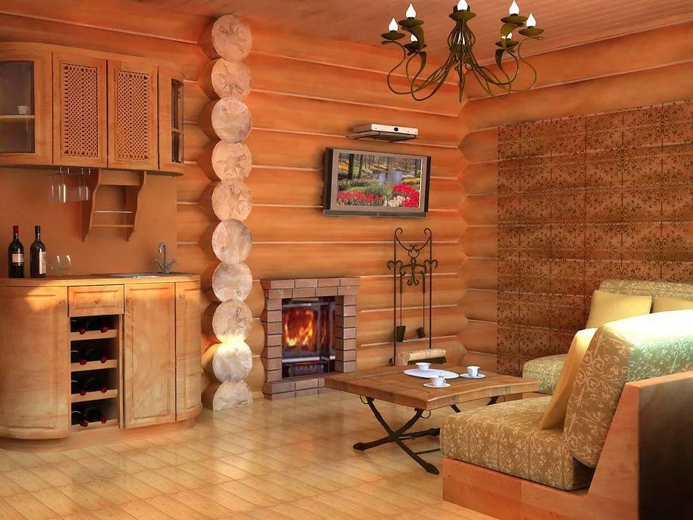 Потолок и пол – тоже деревянные, а на потолке обычно делают балки. Центром комнаты станет большой стол из дуба, а скамьи или стулья располагают вокруг.