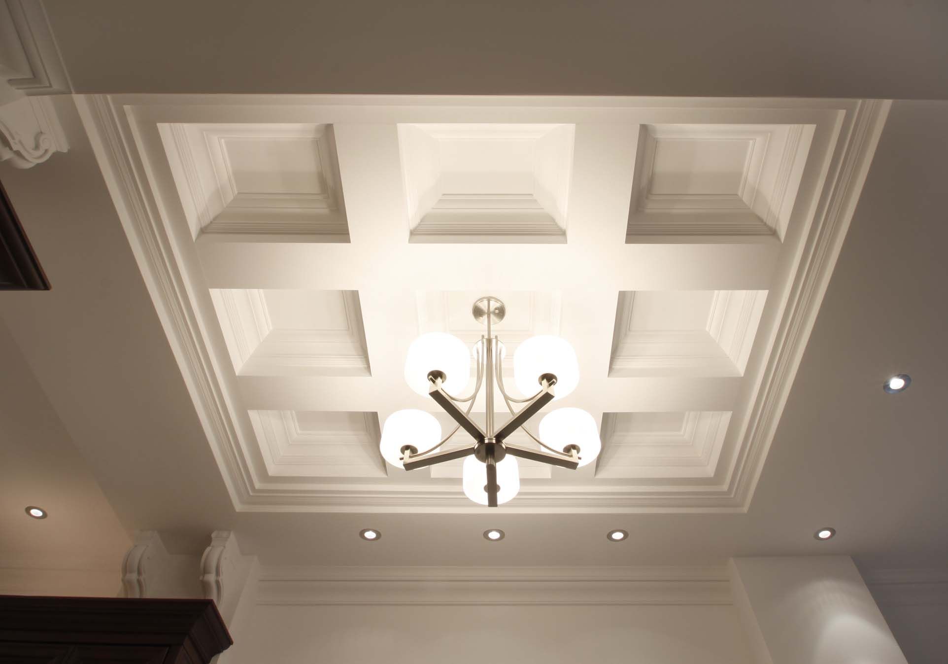Разбросанные по межбалочному пространству точечные светильники усилят этот эффект. Такой метод хорош для больших помещений в классическом стиле. Впрочем, поэкспериментировав с цветами можно найти решение и для более современных типов оформления.